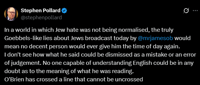 Looks like James O'Brien has found himself in a spot of bother. He recently shared an anecdote from a listener about how his Jewish wife was sent to a sabbath school and taught to hate all Palestinians. She was taught they are cockroaches to be crushed, language not dissimilar to that of Israeli politicians. O'Brien implied this attitude might be part of the problem and he was right.