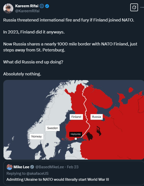 I’ve seen viral memes bragging about how we expanded NATO to Russia’s doorstep and broke red line after red line and Putin didn’t retaliate so we should bring Ukraine into NATO. This overlooks that NATO expansion was one of the key factors that led to war.
