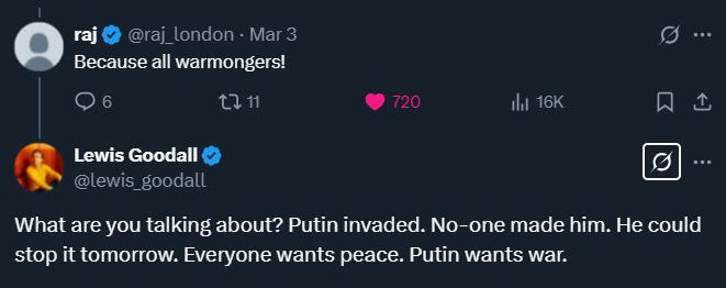 We are not supposed to hear the counter-arguments to Starmer’s position because those arguments would make the public think twice. People have to be convinced there is no alternative to war with Russia before they will go along with it. They have to be convinced that Russia is a supreme evil and Ukraine is noble and pure. This explains the following response from Lewis Goodall: