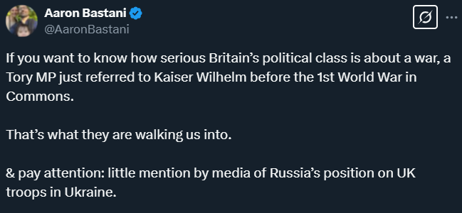 Have you noticed how we’re not seeing a word of caution from mainstream journalists, not even a “maybe World War III is not such a good idea” or “perhaps our approach is not the best way to avoid it”? There is no caution, simply the narrative that Starmer is looking statesman-like and anyone outside the groupthink is basically a traitor. How is this healthy?