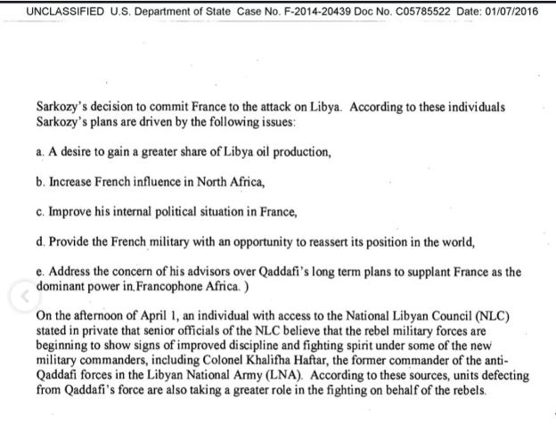 The documents also discussed Sarkozy’s decision to act, which was as follows: a desire to obtain a greater share of Libya’s oil production, achieve greater French influence in North Africa, improve the political situation in France, reassert the French military in the world, and end the risk of Libya supplanting France as the most influential country on the Francophone nations. In other words, it was just imperialism…