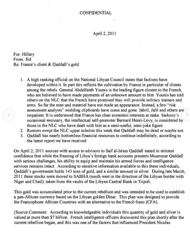 Now that we’ve established the farcical nature of western interventionism, here is the proof that it is evil and dishonest. We have a memo to Hillary Clinton discussing the real motivations for the war. They are as follows: concerns about Gaddafi’s 143 tons of gold reserves and plans to create a gold-backed pan-African currency to replace the CFA (franc). In other words, they were worried that Africa could become independent and prosperous.