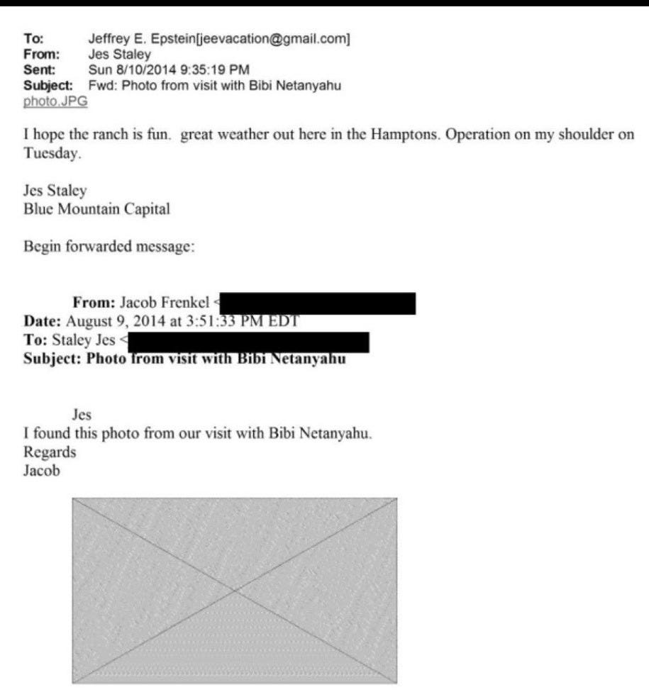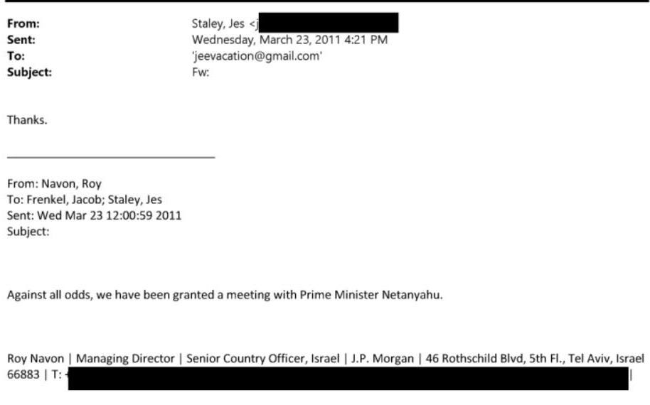 The following exchange again involves Jes Staley, and also Jacob Frenkel whose name wasn’t in the previous exchange. This conversation took place three years later in 2014. There seems little doubt that Epstein met Netanyahu on this occasion.