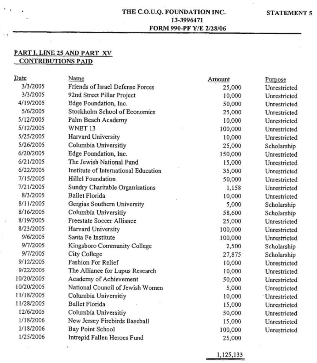 It is a page from the 2006 tax return for the C.O.U.Q. Foundation Inc., a charity established and controlled by Jeffrey Epstein. This document lists charitable contributions paid out that year. They include $25,000 to Friends of Israel Defense Forces, $15,000 to The Jewish National Fund, and $50,000 to the pro-Israel Hillel Foundation.