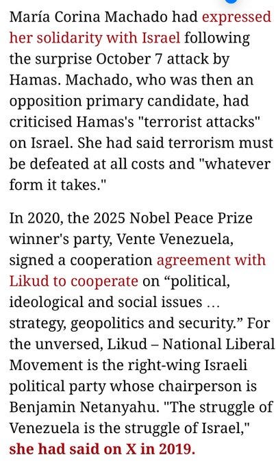 Machado is the Nobel Peace Prize winner who didn’t get the usual torch procession through Oslo because the Norwegian Peace Council did not support her victory. Here is what she thinks about Israel’s genocide:
