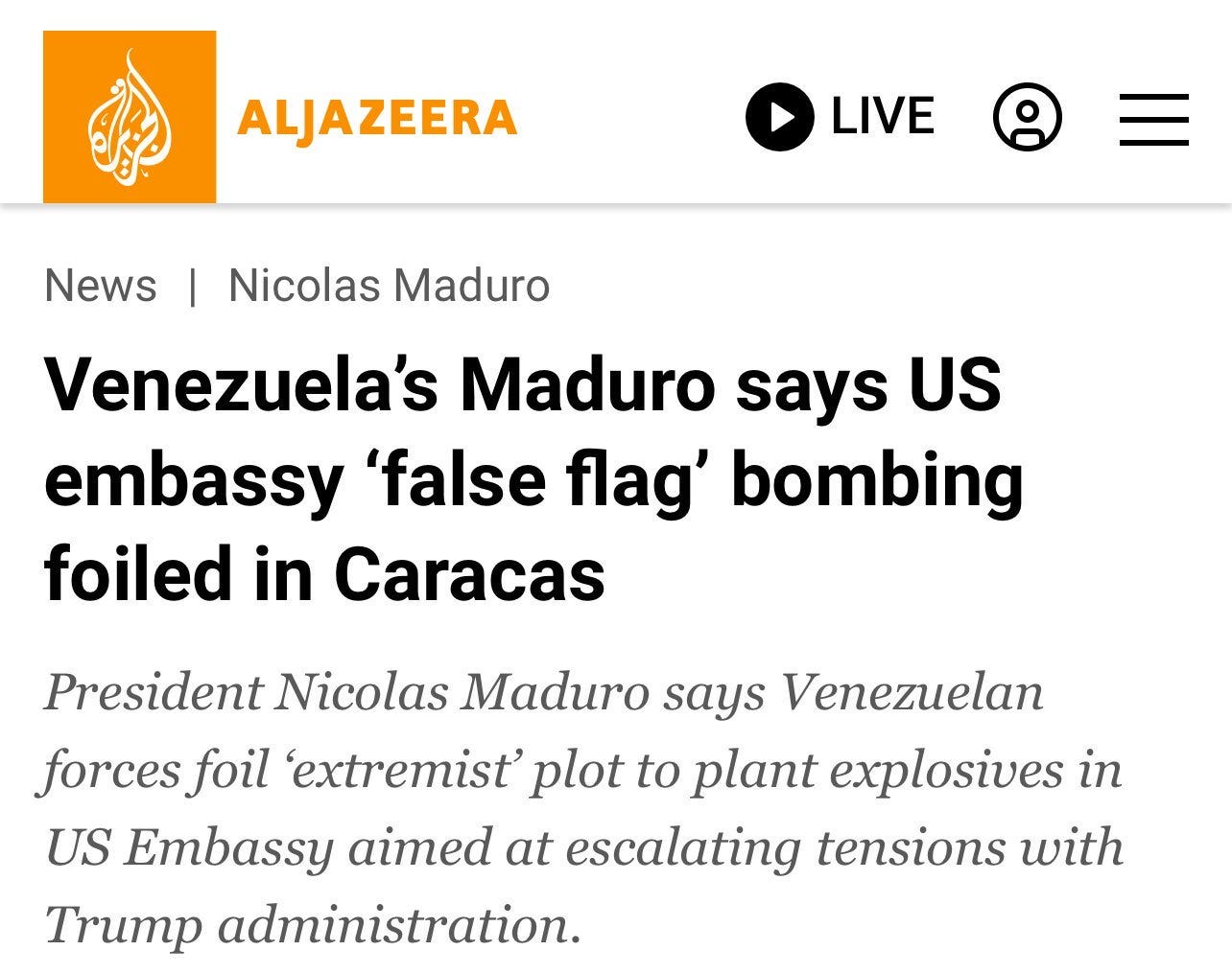The CIA has been caught attempting to carry out two false flags in Venezuela as a pretext for war. Consider this: if those actions would have justified war against Venezuela had Venezuela carried them out, in order to be logically consistent, you must say those actions would justify war against the US if the US carried them out.