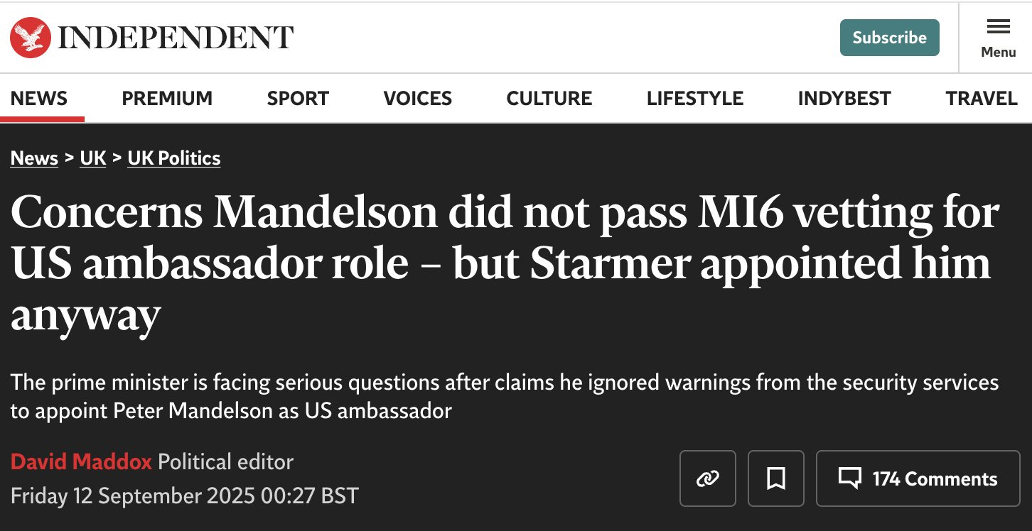 The latest scandal involving Mandelson is that he failed his security vetting in January 2025, but was given the role of ambassador to the US anyway. The claim is that the Foreign Office overruled security officials because Starmer had already announced the appointment of Mandelson prior to the process being completed. The implication is that they didn’t want to embarrass the prime minister, so they jeopardised national security to spare his blushes.