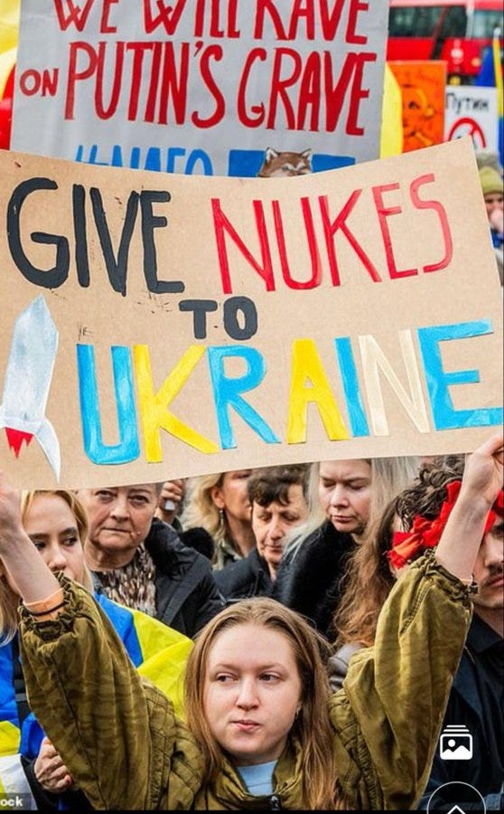 About that support… the media has been telling us that a few hundred pro-war protesters in London somehow represent the wider public. Some of those pro-war protesters were waving signs saying “give nukes to Ukraine”. This is the insanity we’re dealing with.