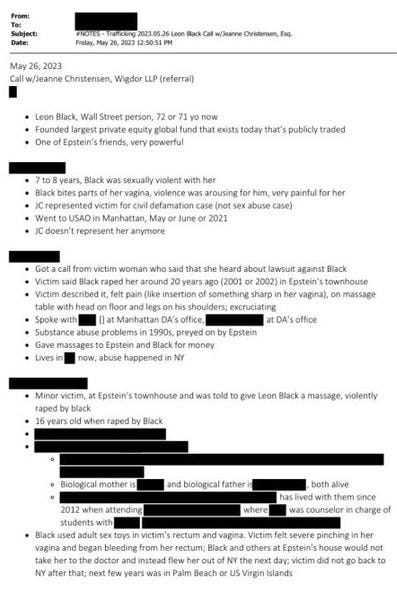 One of the new names to be revealed is billionaire Leon Black, a Wall Street lawyer who founded the largest private global equity fund. He and Epstein plotted to get a woman deported because she threatened to expose their relationship to his wife, but that is far from the worst of it.
