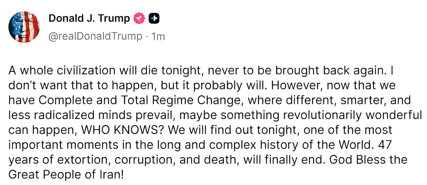 We had witnessed a terrifying escalation in rhetoric when Trump gave Iran a deadline to reopen the Strait of Hormuz. He said that Tuesday is “Power Plant and Bridge Day” when he will destroy Iran’s critical infrastructure to force the country to its knees. He forgot his role as “liberator” when he justified his threats to reporters by saying “they’re animals”. Yesterday, he went even further on Truth Social, warning “a whole civilisation will die tonight, never to be brought back again”. It left many wondering if he would use nukes.