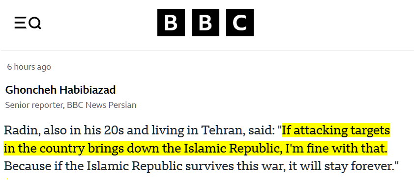 The BBC is normally subtle in its propaganda, hiding some truths, and gently steering your thoughts in certain directions, but there was nothing subtle about an article on the BBC website. It contained a quote from a young Iranian, claiming they were happy with the US “using an atomic bomb or levelling Iran”. Either the BBC interviewed a lunatic, or they made that quote up.