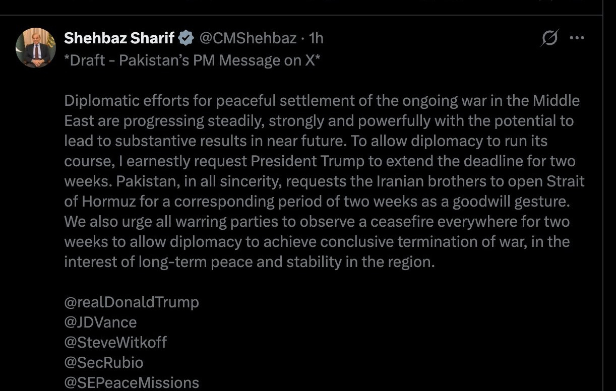 The ten-point plan that Iran had offered weeks ago is now being presented as fresh proposals to help Trump save face. Embarrassingly, Trump sent instructions to the Pakistani prime minister to tweet out that he had played a role in reaching this point. The edit history of his Twitter post gave the game away. It showed that words “Draft - Pakistan's PM Message on X” were initially copied across before being deleted.
