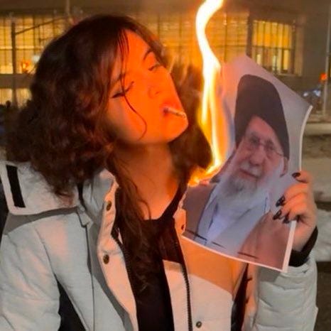 War propaganda is clever because it uses different approaches for pro-war conservatives and regime change liberals: To get liberals on board, you get some attractive women in France or Canada to tear off the hijab and smoke cigarettes and burn pictures of the Ayatollah. You appeal to the western feminist who likes to pretend all Iranian women are like them but sneers at anyone wearing a headscarf out of choice.