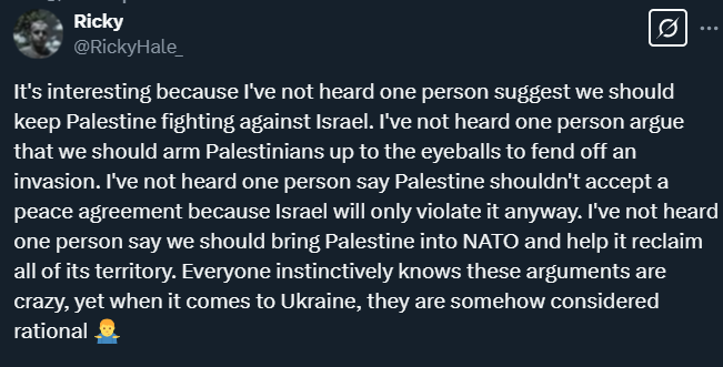 In the case of Palestine, everyone (who is not a Zionist) recognises that a negotiated settlement is the only option because any other approach would result in the extermination of Palestinians. You will never hear a liberal making the above arguments about Gaza, but they switch their brains off when it comes to Ukraine. Suddenly, ideas that would sound crazy about any other conflict are treated respectfully and anyone calling for peace is treated like the enemy.