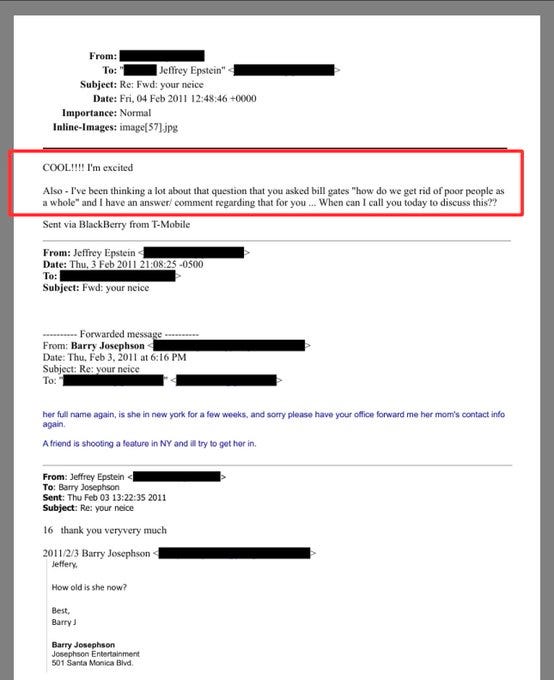 The next email discusses a “photo shoot” opportunity for someone’s niece. It mentions her “mom’s contact info” suggesting she is likely to be young. Epstein mentions a conversation with Bill Gates about getting “rid of poor people as a whole”. The name at the top is redacted — it is the person who forwarded the chain of emails to Epstein. Other names are not redacted. The conversation involves Epstein and Hollywood producer Barry Josephson.