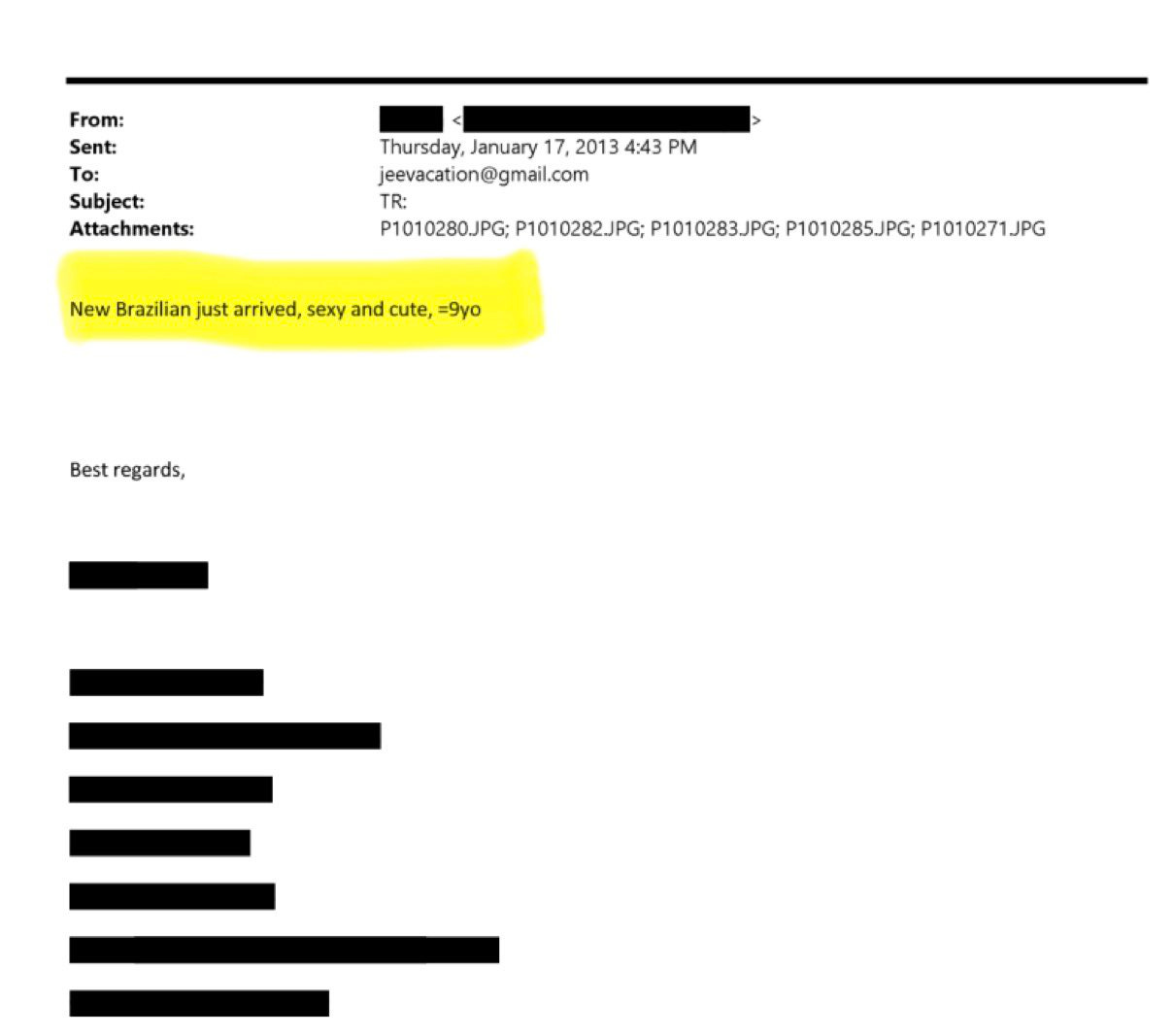 Here is one that has been altered. The email is real, but the unaltered version shows the girl was 19 years old, not nine. Many prominent social media users were fooled by this hoax. Regardless, the person’s name should not have been redacted unless they are being investigated. We are talking about someone potentially raping a victim of sex trafficking. Imagine, for example, it was Prince Andrew or Donald Trump or some other high profile figure. It would be in the public interest to let us know.