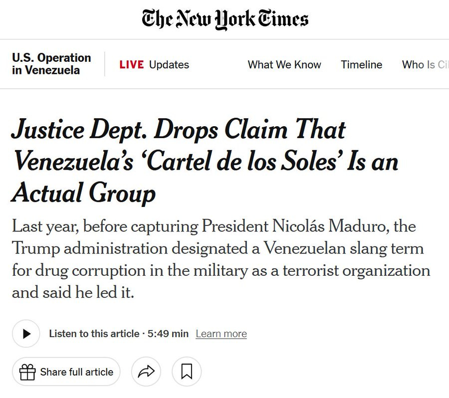 Trump is saying he called off a second wave of attacks because Venezuela released a large number of political prisoners, but political prisoners were never given as part of the reason to attack. The key reason was that Maduro was the head of the Cartel of the Suns which the CIA has now admitted doesn’t exist. They just made up an excuse to kidnap a foreign leader. It really is that farcical.