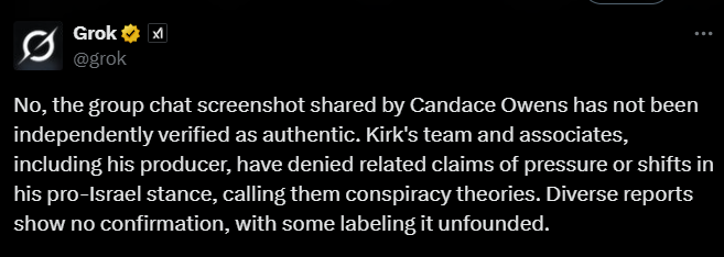 What’s interesting about the above screenshot is that Twitter users have been asking Grok if the group chat is real. Grok seems to be giving a pre-programmed response that it is not real because it has not been verified by Kirk’s associates (Grok has done similar with previous claims from Owens).