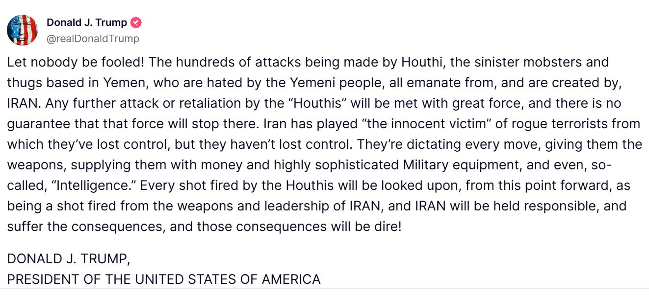 Let’s be honest, trying to predict Trump’s next move is like trying to predict how piss will blow in the wind, but given he is currently attacking Yemen to protect genocidal Israel, and openly threatening regional war, only a fool would call him a peacemaker.