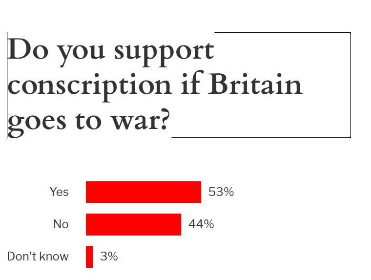 According to polling data, around two-thirds of fighting age Britons would be unwilling to fight, but our freedom lovers would force them to fight anyway, assuming the polls aren’t manipulated. A worrying 53% of respondents in an Express poll said they would support conscription. Other newspaper polls suggest the public is very much divided on conscription, but the newspapers are overwhelmingly in favour and disgusted the public aren’t.