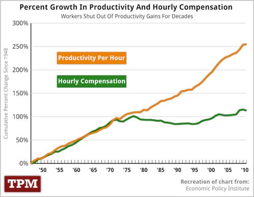 Our rulers want you to fight for a world of unlimited productivity and unbearable poverty. A world where you don’t reap the rewards of your productivity and the moment you cease to be productive, you die. Just look at that productivity gap, it’s not going to get any better.