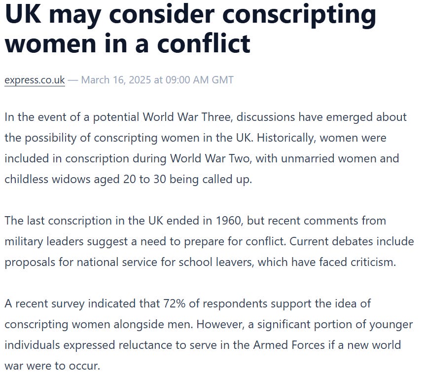 The media is reminding us that in World War II, childless women were conscripted, and they are super keen to bring this back. Just know it doesn’t count as equality when rich arseholes are using you as pawns. This farce would not make Armageddon any more progressive.