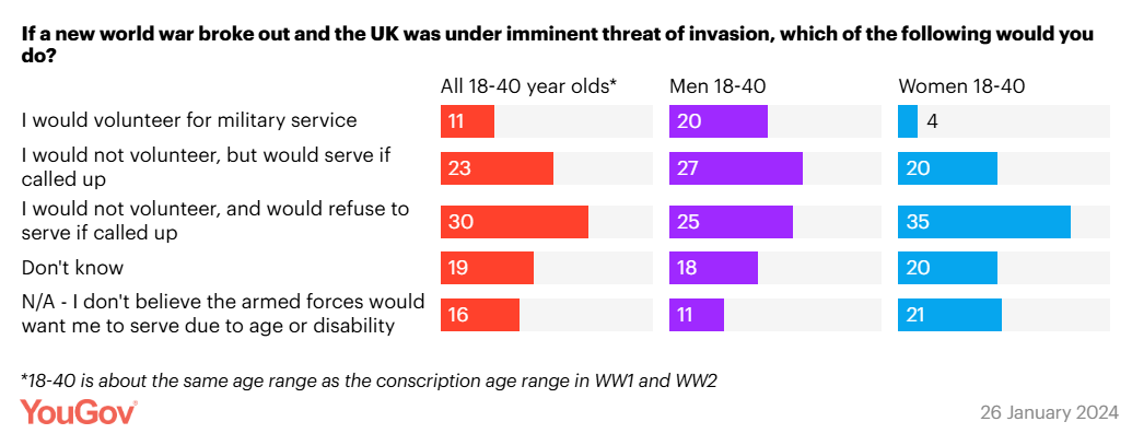 A YouGov poll from 2024 showed only 12% of men and 3% of women would volunteer to fight in a world war. A further 27% of men and 16% of women would fight if called up. A whopping 65% of 18-40s would either refuse to fight or don’t believe they would be required.