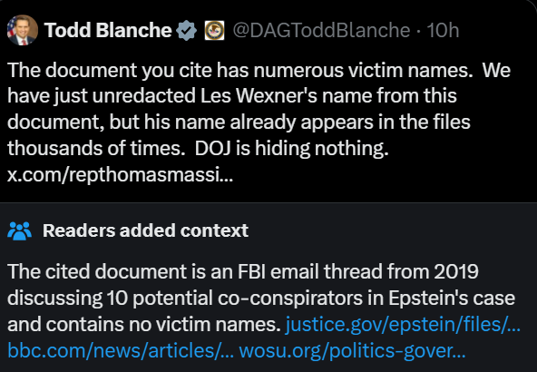 There is zero reason for Wexner’s name to have been redacted, yet Todd Blanche claimed he was protecting victims’ names in an online exchange with Massie. This was a provable lie! The document contains no mention of victims’ names.