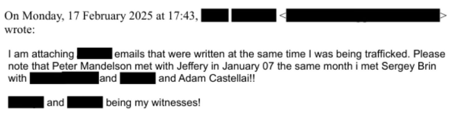 At this point, it seems absurd to suggest Epstein was not trafficking girls to others, especially given the testimony from the victims. Virginia Giuffre said she was trafficked to Glenn Dubin who raped her while his pregnant wife slept in the next room. And here is a message from one of Epstein’s victims, describing herself as being trafficked. She named Peter Mandelson, Sergey Brin, and Adam Castella, although it’s unclear what their involvement was, if any.