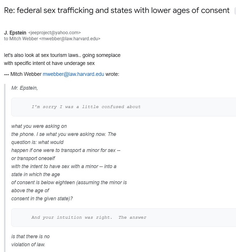 Here is Epstein seeking advice from Mitch Webber on sex tourism laws and age of consent in different jurisdictions. Webber specifically talks about transporting a minor to another state for sex. He confirms this would be legal as long as they are above the age of consent in the state they are being taken to.