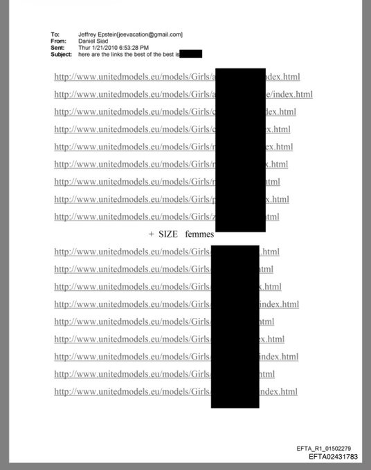 It seems clear the FBI knows exactly who the co-conspirators are, yet it is acting like it knows nothing when the evidence is right in front of us. Here is someone called Daniel Siad sending Epstein model listings in 2010, not long after Epstein’s prison sentence. I don’t know about you, but I’ve got an inkling this is not about modelling.